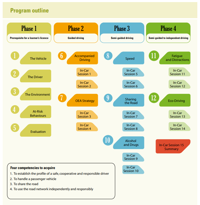 In Quebec, the new mandatory Driver Training Program has been implemented since January 17th 2010. The programme is divided in 4 phases where Classroom modules alternate with In-Car Sessions. The course consists of 12 two-hour theory modules and 15 hours In-Car Sessions. Within each phase, some modules are interchangeable but it is recommended to take them in the pre-programmed order. In each one of the phases, self-learning periods are highly recommended. You can learn on your own via the SAAQ website and by using your Driver’s handbook “To Master Driving.”.